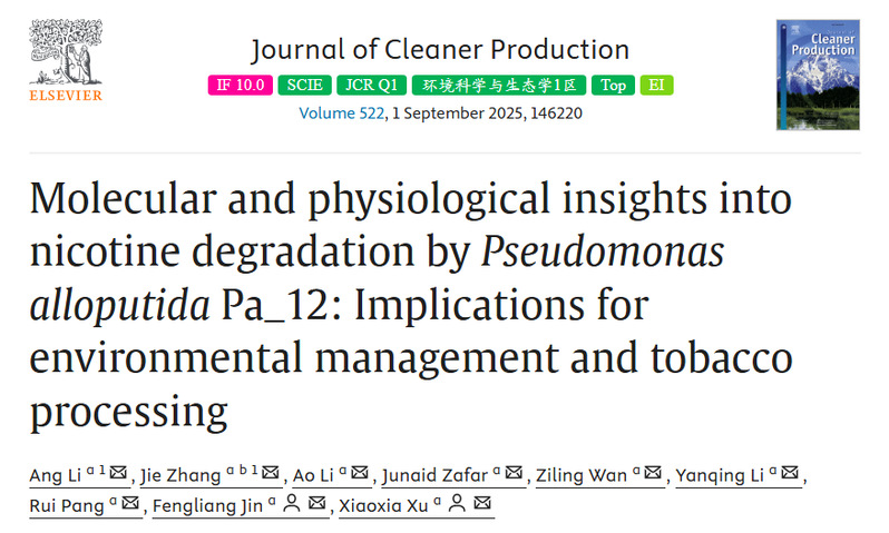 近日,华南农业大学植物保护学院/绿色农药全国重点实验室金丰良/许小霞团队在Journal of Cleaner Production(中科院一区Top,IF5year = 10.7)发表了关于异恶臭假单胞菌Pa_12降解尼古丁机制与应用的研究论文。该研究通过多组学分析明确了Pa_12的系统分类与代谢特性,发现在pH 7、30°C条件下该菌株具有高效尼古丁降解能力。实验表明,Pa_12可在烟草叶片成功定殖,促进植物生长并显著降低尼古丁含量。LC-MS/MS分析揭示其通过一条新型代谢途径将尼古丁转化为2,5-二羟基吡啶,避免了传统途径中有害副产物的生成。该研究为烟草废弃物的绿色处理与烤烟品质提升提供了新思路,在环境修复与可持续农业领域具有重要应用潜力。