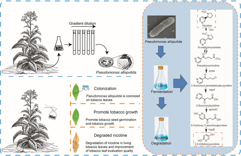 本研究分离得到一株异恶臭假单胞菌(Pseudomonas alloputida)Pa_12,具备中等尼古丁降解能力。与同类菌株不同,Pa_12通过吡咯途径将尼古丁转化为2,5-DHP,规避了有害副产物的产生。Pa_12能够在烟叶中有效定殖,显著降低尼古丁含量、改善感官品质并促进植株发育。该研究为烟叶尼古丁降解提供了新策略,也为推进烟草可持续种植与废弃物绿色处理提供了技术支撑。