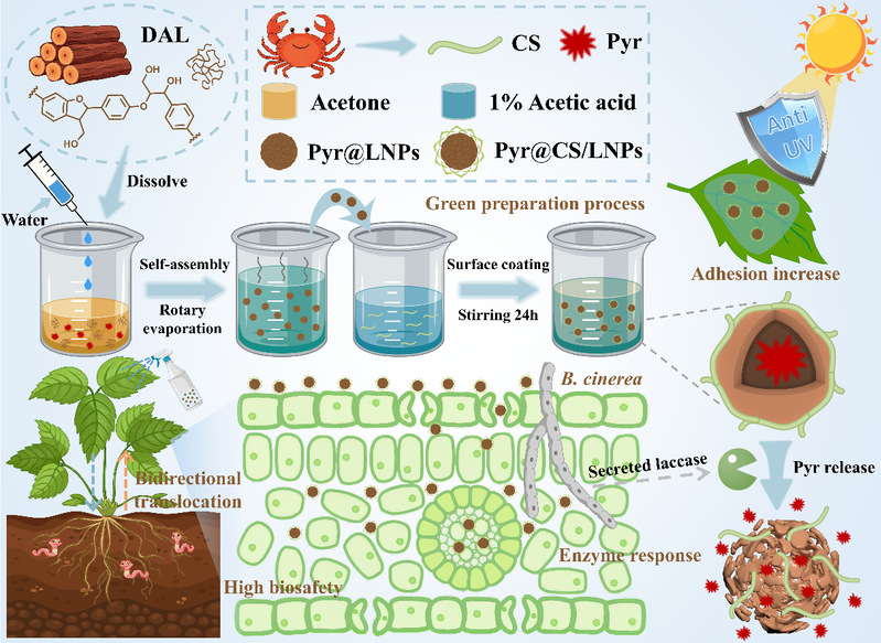 研究团队以天然可再生资源木质素和壳聚糖为原料,基于自组装与静电吸附作用,成功构建了负载吡唑醚菌酯的纳米载药系统(Pyr@CS/LNPs)。该系统为全水基配方,不含有害有机溶剂,载药量高达46.66%,具备良好的生物相容性与可降解性。在灰霉病菌分泌的漆酶响应下,纳米载体可实现快速降解,从而精准释放农药至病害部位,显著提高药效。此外,壳聚糖涂层显著增强了纳米颗粒在草莓叶片上的粘附与持留性,在模拟雨水冲刷后,其在叶面的残留量达到传统制剂的3.15倍。该载体可在草莓植株内实现由根向叶与由叶向根的双向传输,有效提高了农药在植物体内的分布均匀性。在生物安全性方面,与常规吡唑醚菌酯制剂相比,Pyr@CS/LNPs对蚯蚓的急性毒性降低了3.04倍,对草莓生长无不良影响,展现出良好的生态相容性。该纳米载体还显著增强了吡唑醚菌酯的光稳定性,其在紫外照射下的半衰期延长了2.65倍,进一步提升了其在田间实际应用中的潜力。综上,该研究建立了一个生态友好、可持续的精准农用化学品纳米递送平台,为推进绿色农业技术提供了一个有希望的解决方案。
