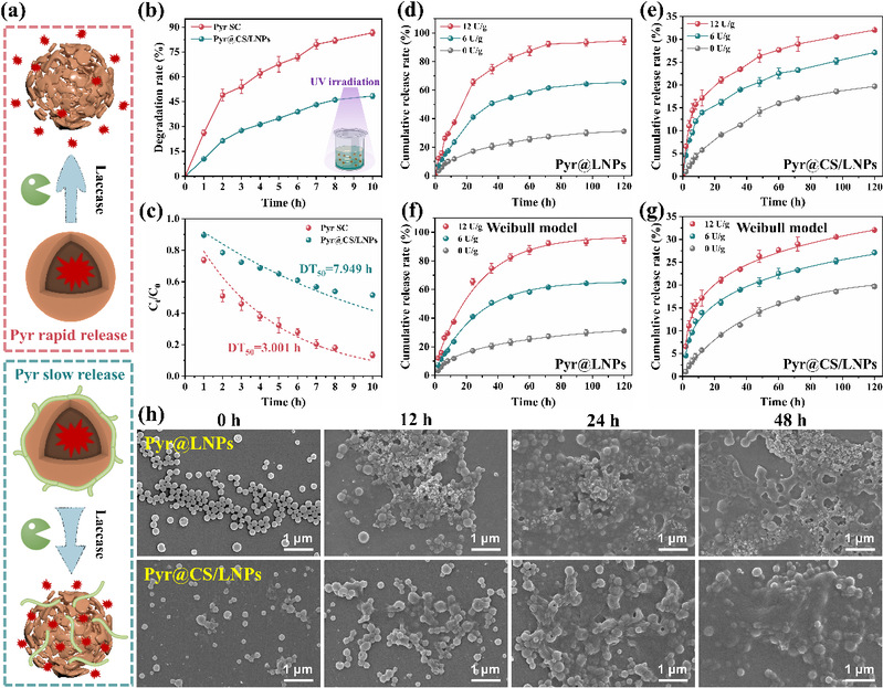 (a) Pyr@LNPs和Pyr@CS/LNPs的漆酶响应示意图;(b) Pyr SC和Pyr@CS/LNPs的紫外降解率及(c) 伪一级动力学;(d) Pyr@LNPs和(e) Pyr@CS/LNPs的累积释放曲线;(f) Pyr@LNPs和(g) Pyr@CS/LNPs的Weibull释放模型;(h) Pyr@LNPs和Pyr@CS/LNP在12U/g漆酶溶液中孵育0、12、24和48小时后的SEM图像。