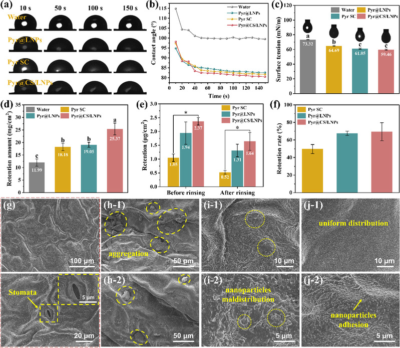 (a, b) 水、Pyr SC、Pyr@LNPs和Pyr@CS/LNPs在草莓叶片上的接触角;(c) 水、Pyr SC、Pyr@LNPs和Pyr@CS/LNPs的表面张力;(d) 水、Pyr SC、Pyr@LNPs和Pyr@CS/LNPs在草莓叶片上的最大持留量;(e) 洗涤前后草莓叶片上Pyr SC、Pyr@LNPs 和 Pyr@CS/LNPs的Pyr含量和(f)残留率;用(g)水、(h)Pyr SC、(i)Pyr@LNPs和(j)Pyr@CS/LNPs处理草莓叶片表面洗涤前后的SEM图像。