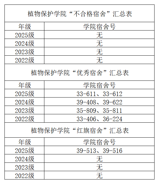 为进一步加强宿舍文明建设,营造良好的学习生活氛围,根据《华南农业大学学生公寓管理规定》等要求,学院于2025年10月20日—10月26日组织团学工作人员、各年级级委、志愿者等对本科生宿舍内务卫生进行普查。根据宿舍卫生普查结果,现将植物保护学院2025-2026学年度第一学期10月份“红旗宿舍”评比结果公示如下:
