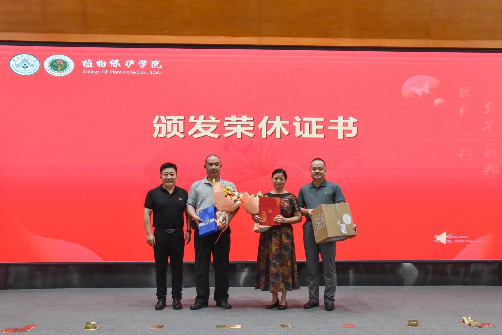 在荣休仪式上,金丰良院长对文艳华老师、沈斌斌老师、潘汝谦老师、廖美德老师光荣退休表示热烈的祝贺,并衷心感谢他们一直以来对学院学科发展的无私奉献和辛勤付出。王华霖书记在讲话中表示,四位荣休教师将人生宝贵岁月奉献给植保教育与科研事业,生动诠释了教育家精神“心有大我、至诚报国”的理想信念;他希望青年教师以荣休教师为榜样,传承学术薪火、汲取奋进力量;希望荣休教师继续为学院发展发光发热,并衷心祝愿他们退休生活精彩纷呈、幸福安康。