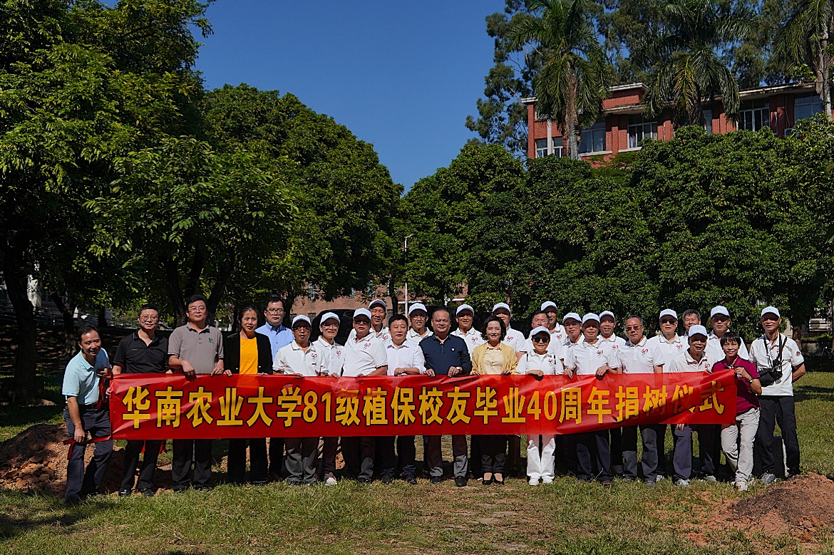11月17日上午,1985届植保校友“毕业40周年”捐树活动在红满堂东侧龙眼园举行。1985届校友代表与学校对外联络处(校友会、教育发展基金会秘书处)、总务部及学院相关负责人共同出席活动,一起培土植树,共同见证两颗“龙眼树”扎根华农沃土,延续校友情谊。
