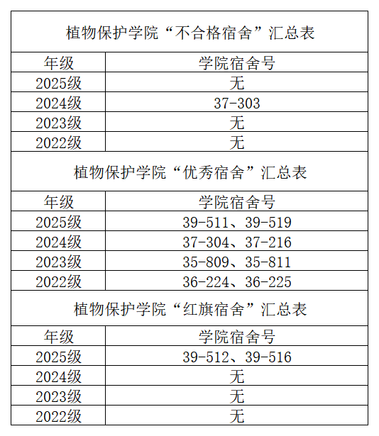 为进一步加强宿舍文明建设,营造良好的学习生活氛围,根据《华南农业大学学生公寓管理规定》等要求,学院于2025年12月24日组织团学工作人员、各年级级委、志愿者等对本科生宿舍内务卫生进行普查。根据宿舍卫生普查结果,现将植物保护学院2025-2026学年度第一学期12月份“红旗宿舍”评比结果公示如下: