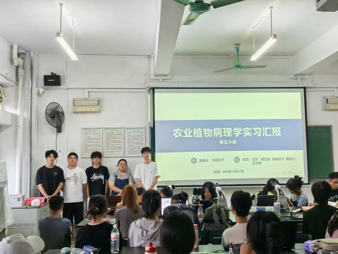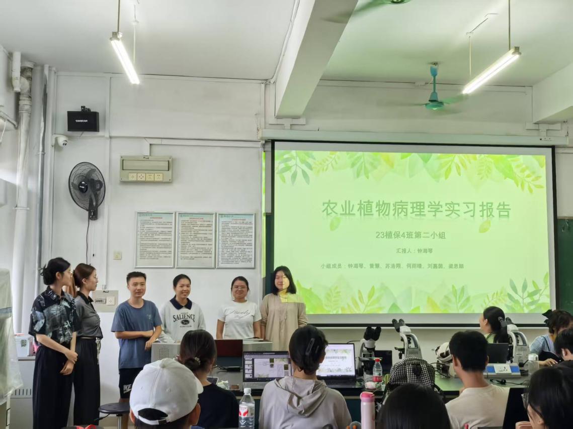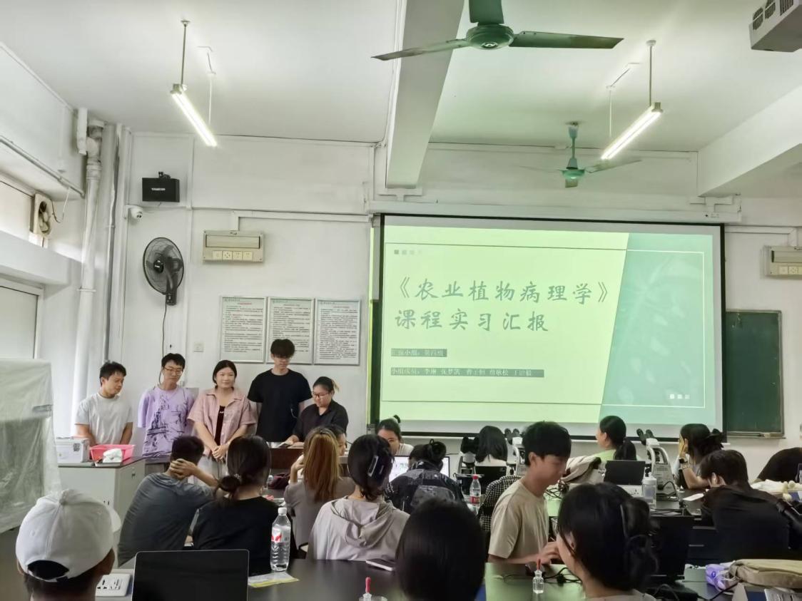 在集中实习末期,我们回顾实习过程,系统梳理实习成果,将知识内化与共享,举办一场实习总结交流报告会(图12至图16)。会上,各小组分别展示了各自的实习成果及实习风采:有的小组按农作物分类汇报病害采集鉴定成果,横向对比了同一种作物的不同病害,为病害综合防治提供新的角度;有的小组按病原物分类汇报病害采集鉴定结果,纵向对比了同类病原物为害不同的作物,为病害精准防控提供了新的思路。周而勋老师对每组汇报都进行了专业而精彩的点评,既肯定了同学们的努力和亮点,也指出了报告中存在的不足和改进方向,并引导大家就一些共性问题展开深入讨论。