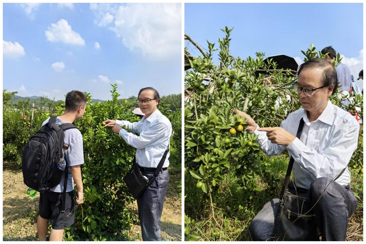 图7周老师指导同学们识别柑橘病害症状(四会砂糖桔园)